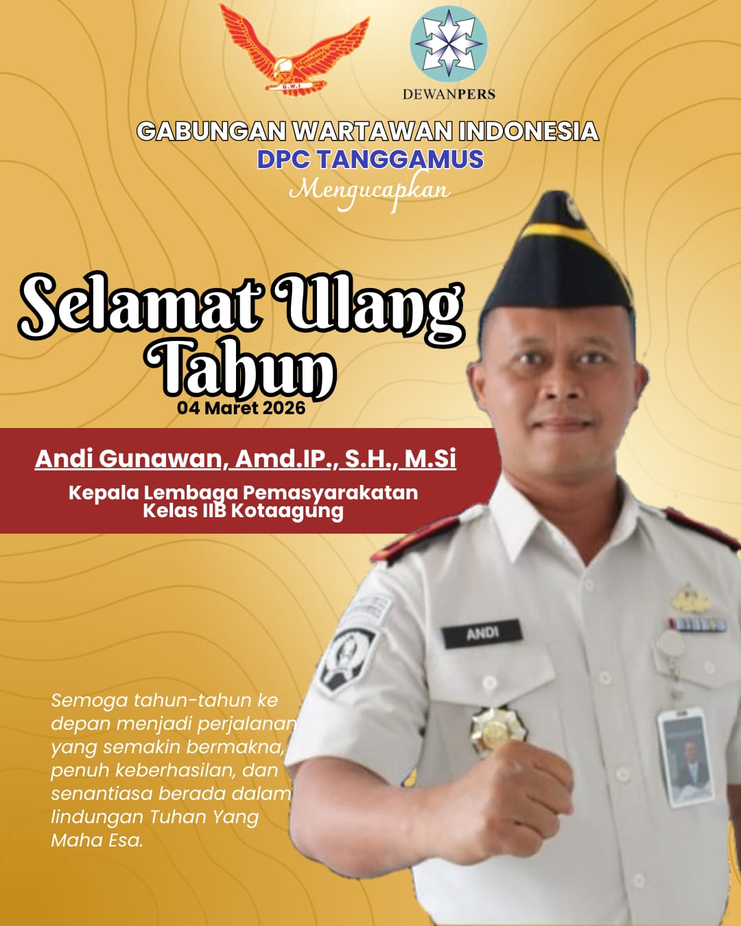 Tanggamus –Bintang Nusantara News- Ulang tahun bukan sekadar penanda bertambahnya usia, melainkan momentum refleksi atas pengabdian dan tanggung jawab yang diemban. Pada 4 Maret 2026, Kepala Lembaga Pemasyarakatan Kelas IIB Kotaagung, Andi Gunawan, A.Md.IP., S.H., M.Si., kembali diingatkan pada satu hal penting: amanah negara yang melekat di pundaknya.